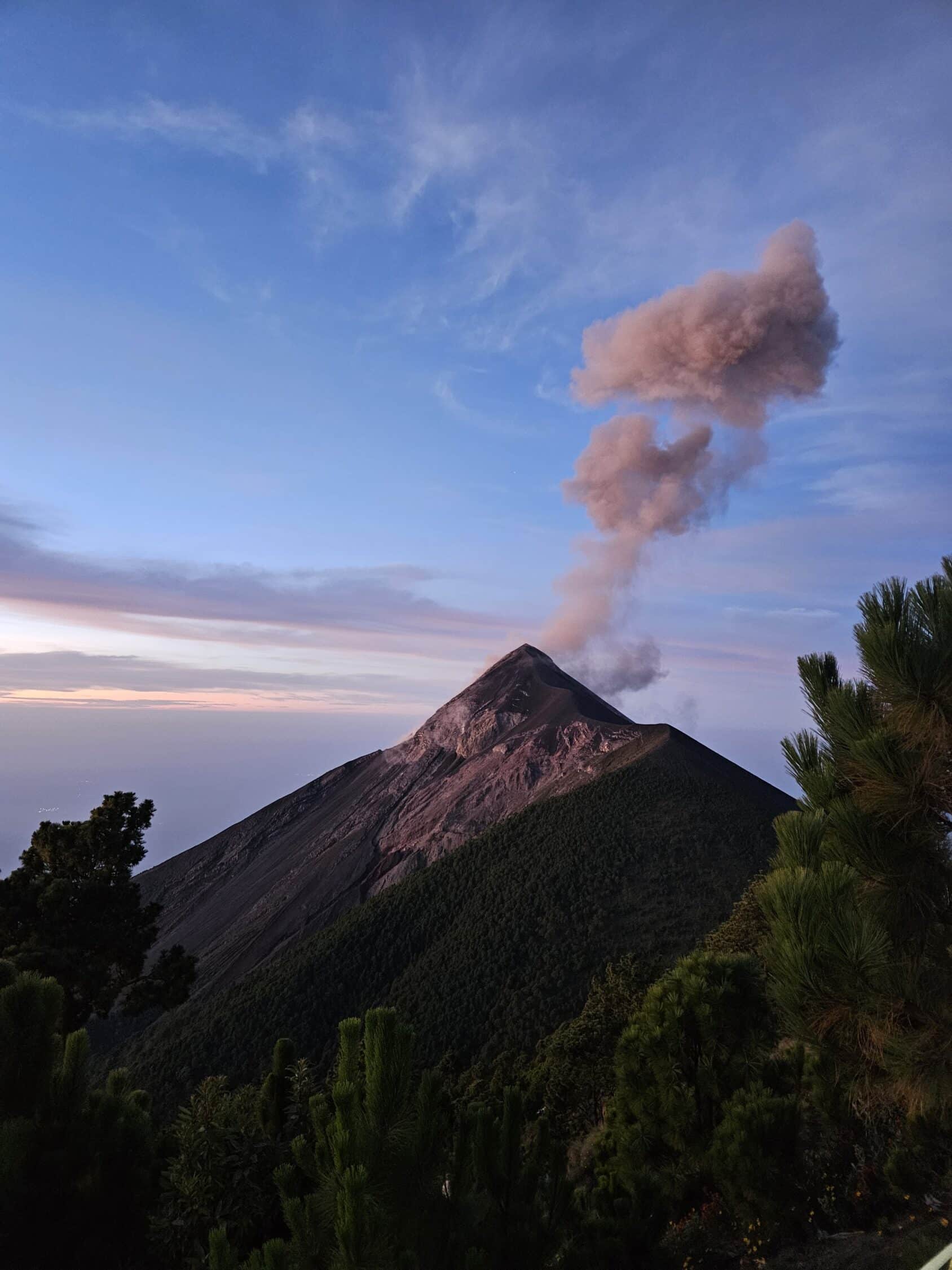 Wir setzen uns, ziehen unsere Snacks aus dem Rucksack – und dann passiert es. Der Fuego bricht aus. Erst hören wir ein dumpfes Donnern, dann steigt eine dicke Rauch- und Aschewolke auf. Ein Raunen geht durch unsere Gruppe. Wir lehnen uns zurück und genießen die ersten Minuten am Acatenango.